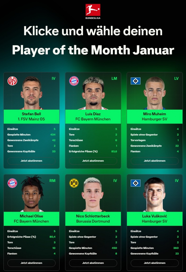 2月5日讯 德甲一月最佳球员候选名单公布,奥利塞、路易斯·迪亚斯、武什科维奇领衔。