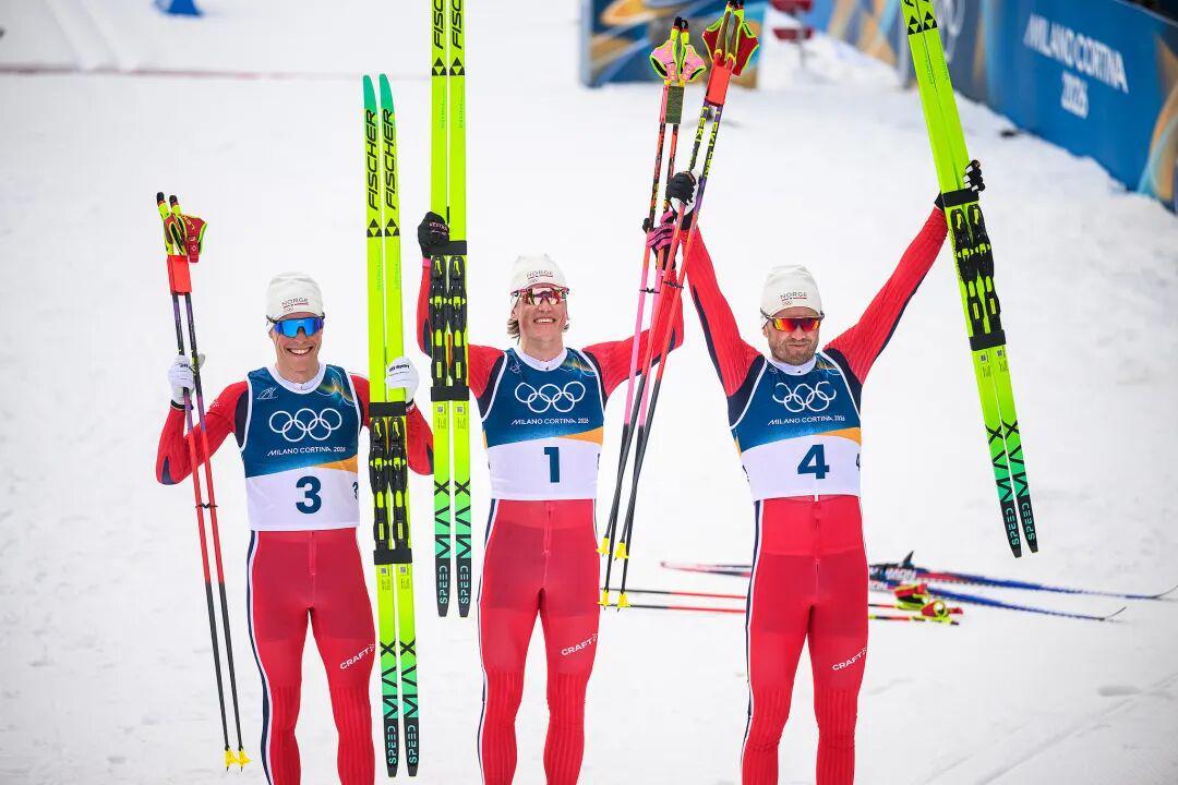 越野滑雪男子50公里集体出发传统技术项目在泰塞罗越野滑雪中心落下帷幕。比赛开始后没有多久,挪威运动员埃米尔·伊韦尔森、马丁·勒斯特伦·尼恩盖特和 “越野滑雪之王”约翰内斯·赫斯弗洛特·克莱博就组成了领滑的第一梯队。他们在全场大部分时间都处于遥遥领先的位置,比第二梯队快了2分钟左右。