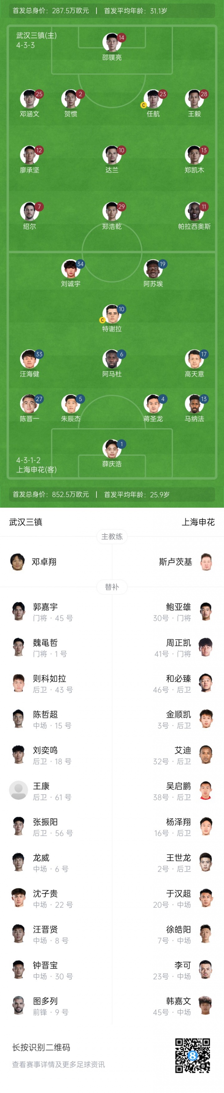 爱游戏数字体验-三镇vs申花首发:邓涵文、任航先发,高天意、刘诚宇、汪海健出战