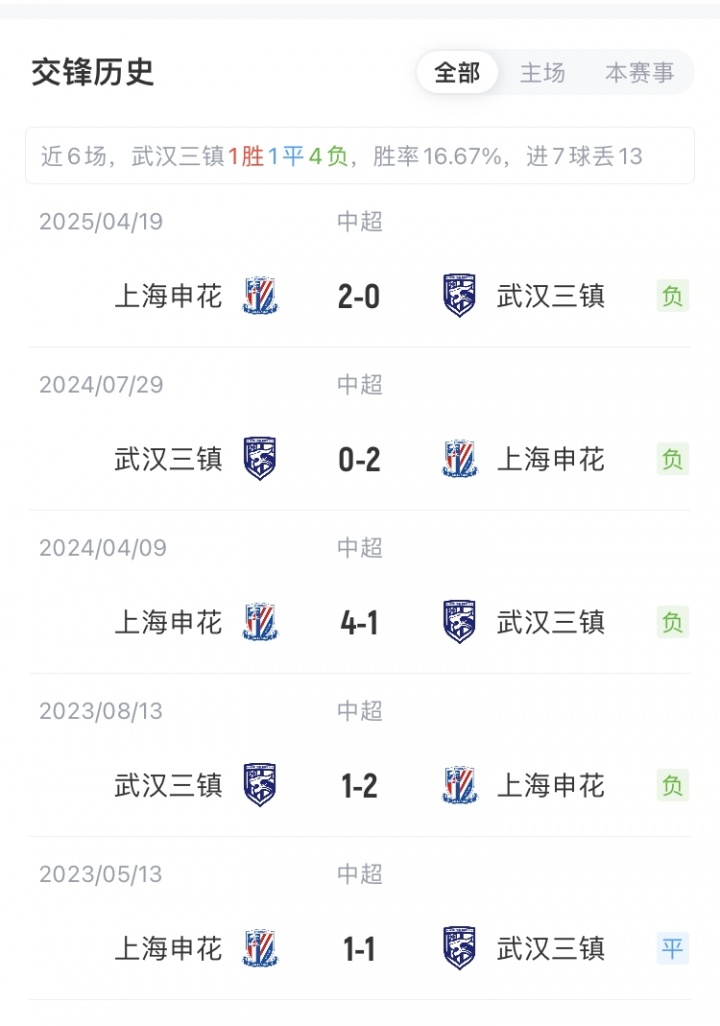 上海申花15胜4平3负积49分,排名中超第2;武汉三镇5胜6平11负积21分,排名中超第12。