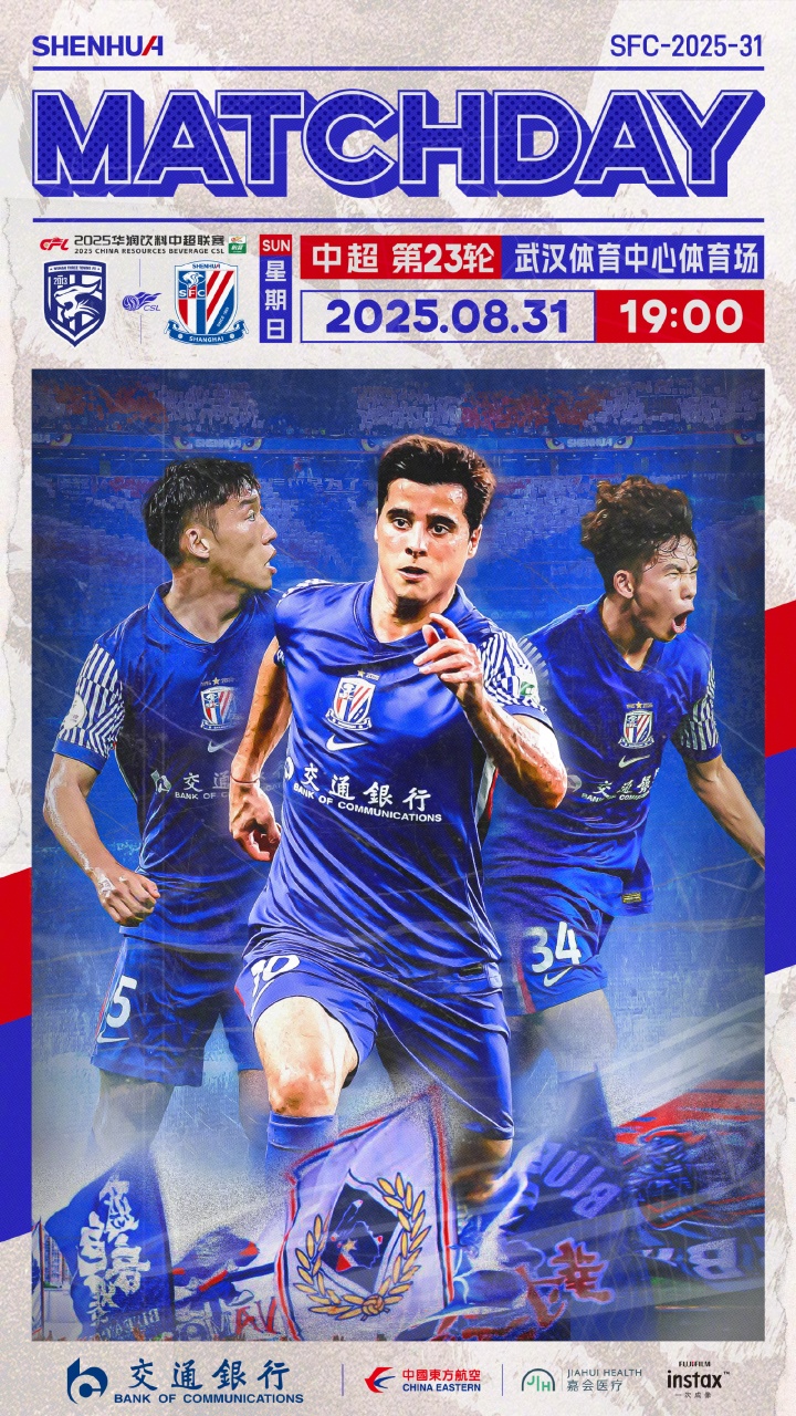 08月31日讯 北京时间19点,中超第23轮,武汉三镇主场迎战上海申花,赛前双方公布首发。