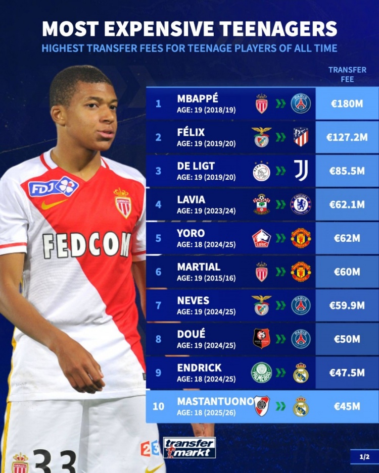 爱游戏品牌互动-足坛历史U20球员转会费榜:姆巴佩居首,菲利克斯、德里赫特前三