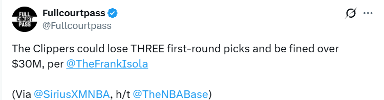 “我听说, 我也不知道真不真,我听说他们(快船)可能会被没收三个首轮签,”Isola在节目上说道。